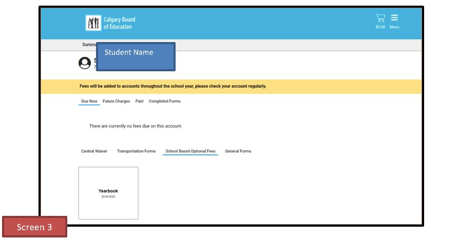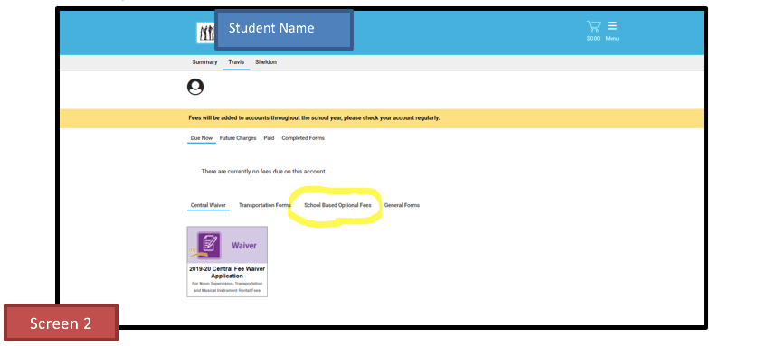 At the bottom of SCREEN 2 you will see "School Based Optional Fees" (circled in yellow). Click on that and it will take you to SCREEN 3.