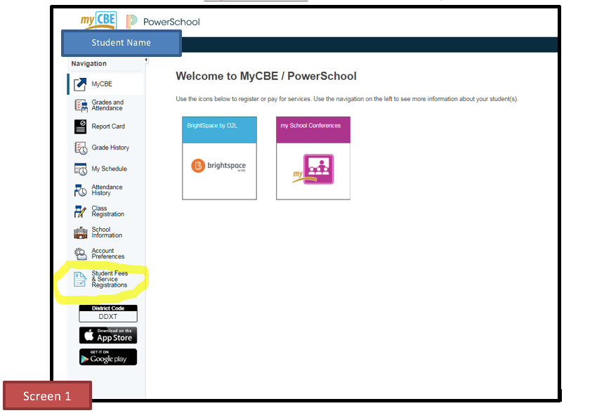 Log into MyCBE / PowerSchool. Once you do, you should see SCREEN 1 (below). Click on "Student Fees and Service Registration" (circled in yellow) and it will take you to SCREEN 2.